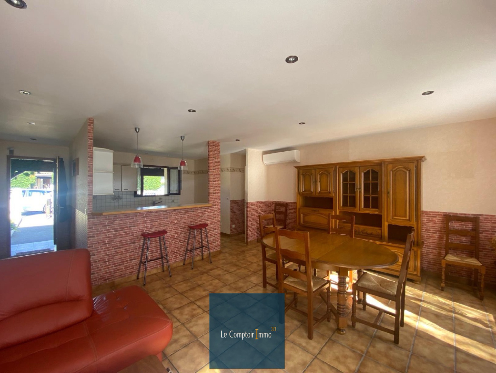 Très lumineuse et de plain-pied, elle offre un salon/séjour climatisé, une cuisine ouverte, un coin nuit avec 3 chambres et une salle de bain.